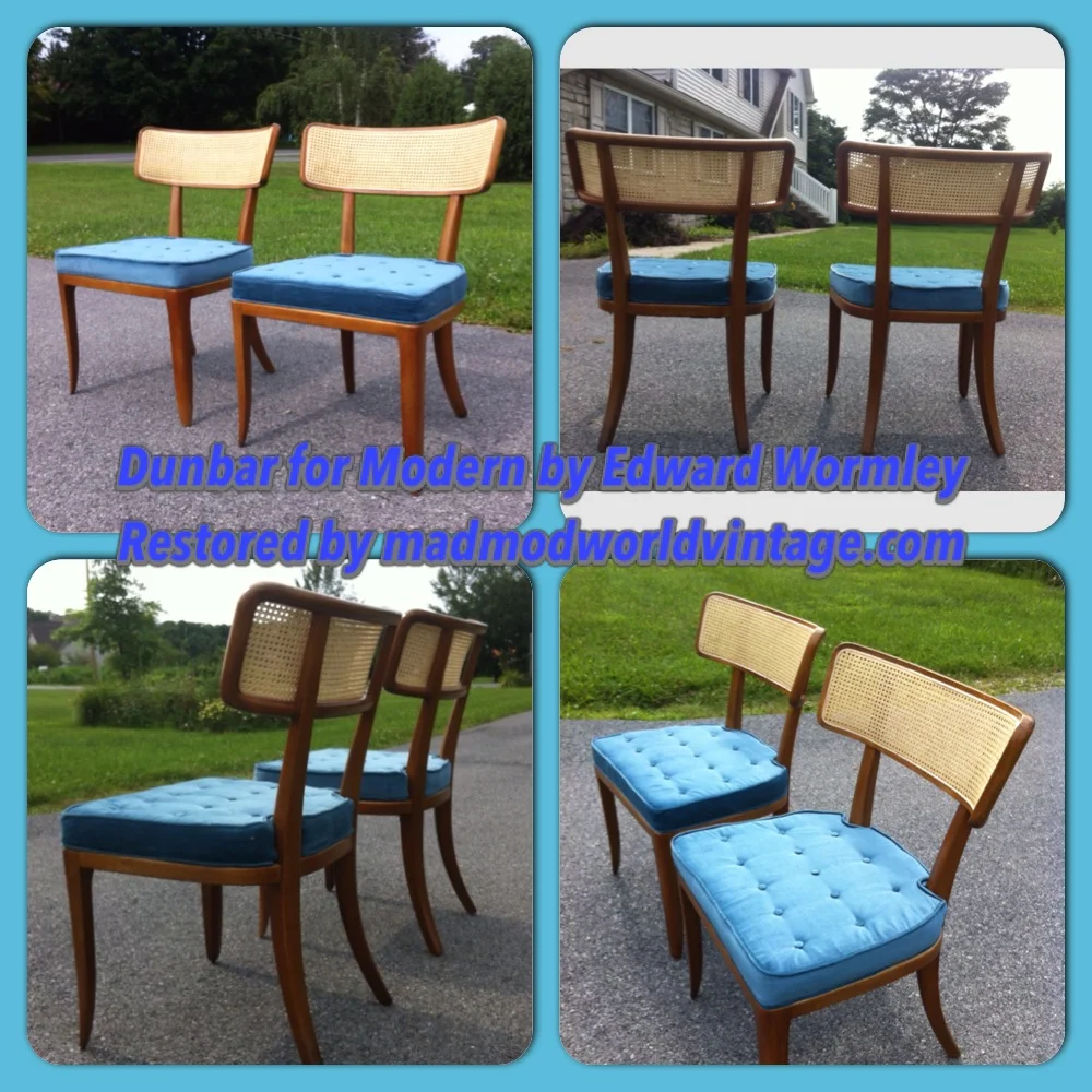 /It's been a busy last couple of weeks! I have been really trying to move forward with the Dunbar chairs and my mother got the sewing done and on I went. It's kind of like an obsession for me when it gets to this point and I am ready to get the project done. Mom did a great job, and yes, I will be paying her for her talents when the chairs sell. The assembly went smooth and I expected nothing less after my mother did her thing. I sat and did the buttons one evening and that was tedious, but not a bad deal. It was very hard to get the buttons to line up straight as the long needle did not go straight through no matter how I tried to line it up. I did end up fixing a few wonky ones after I was finished. When I finally was happy, I added the new dust cover and hand stitched the Dunbar labels back on it. They are now ready to rock. Took some new pictures yesterday outside and now they are ready for a new home! I have them priced at $600 each, only after careful consideration of my time and expenses and others for sale. I have found none is small quantities, however, there are a set of 6 and another set of 8 on first dibs for $18,000. So, I can say I believe my price is a bargain for such exquisite pieces. Surely there is a Wormley fan somewhere that would like one or both as samples of his earlier designs. I am so proud of them and pleased I had a chance to bring them back to their former glory! That's what it is all about! I have already considered the shipping and will definitely be wrapping the chair backs in cardboard to protect the delicate cane during shipping. I will definitely deliver these in person if I can be met in central/eastern PA, NJ or a reasonable distance from my Reading/Allentown area home. Please reach out via email or etsy message! I will also be traveling through Philadelphia in another week so please hit me up if I can deliver anything!