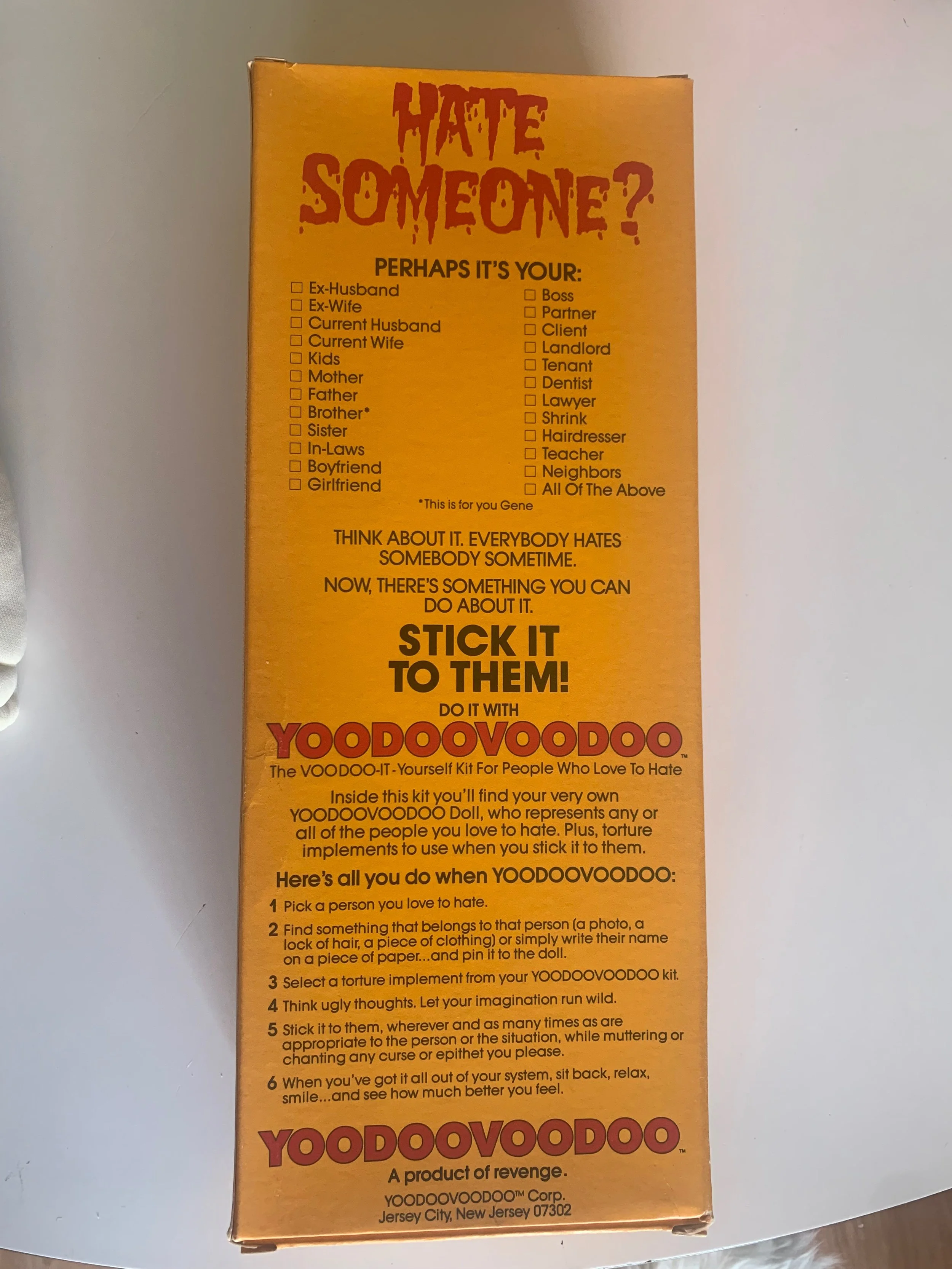 I am down the rabbit hole of research to try to uncover who made these dolls and why! On first glance, I tried to process what era they came from. No barcodes, no websites. That’s a good sign that they are older. There is a ‘reorder’ card on each with a P.O. Box to mail order more dolls. Another sign it was pre-dot com era. Next I hit the web. I found evidence of one or two known dolls via pics. Then I found the some copyright records from the late 80s/early 90s. The next interesting thing to note is an original advertisement for the doll! It came from an 80s/90s magazine called SPY. It was a satirical journaling of NYC area celebrities and upper class folk. Looking like a fun time, I just ordered a book published later that gives a history of the rag mag and may or may not add some additional insight into the doll. There is definitely a story here as this box is all telling. It even calls out ‘brother Gene’ who sounds like the first voodoo victim.