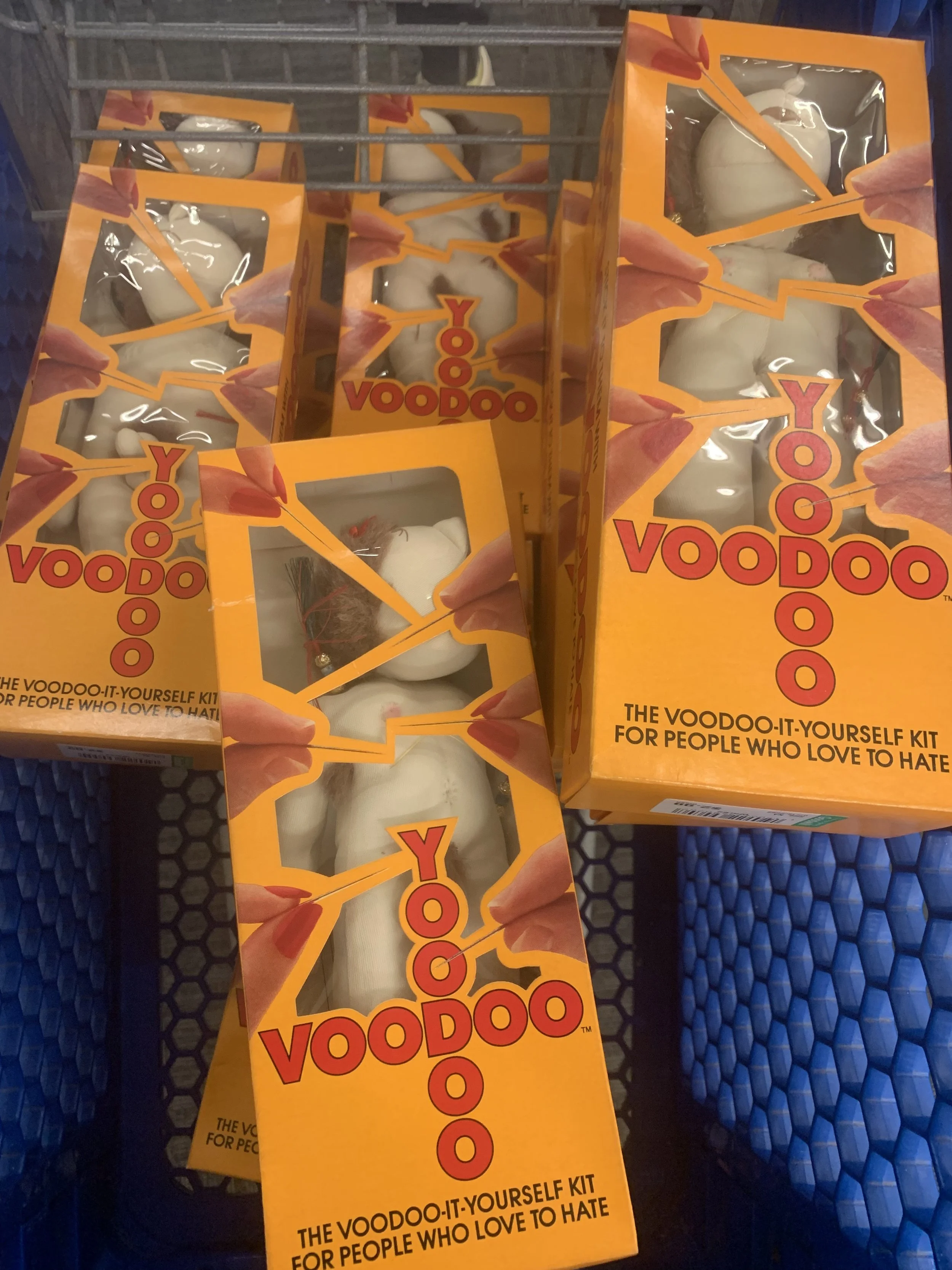 /I rarely source inventory from thrift stores these days. I am busy buying directly from families and helping them in their home clean out or estate liquidation process. So imagine my surprise when I popped in a NJ thrift I was passing and my kid was happy to walk through and I actually found something GOOD. Never expecting much, I was taken aback by a large collection of YOODOO VOODOO dolls. Peeking through the cello I noticed that these dolls were anatomically correct AND were made with nylon stocking like material like a cabbage patch. But what had my attention…..arm pit hair on the lady doll? What is this? The box in and of itself is a masterpiece. ‘Stick it to them with Yoodoovoodoo!’ And ‘The voodoo-it-yourself kit for people who love to hate’, ‘a product of revenge’. The box is sarcastic comedy gold. I had to have them all.